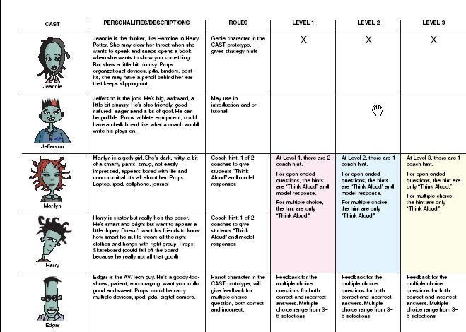 In this project I was able to apply UDL principles from the Center for Applied Special Technology (CAST) as well as those for Palincsar and Brown's Reciprocal Teaching through electronic coaches. We created avatars associated with particular learning strategies to support learning via Chunking, Stop & Think points, Hints, Feedback and Strategy Helps. I explored character animation, text interactions and text-to-speech technologies.