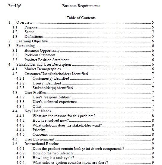 This is an example requirements document. It is important for me to understand the key user needs, the user environment and the instructional routines. I combine my background in educational psychology, information systems, experience design, content architecture and digital media production to explore solutions that utilize available technologies to support digital learning and teaching.