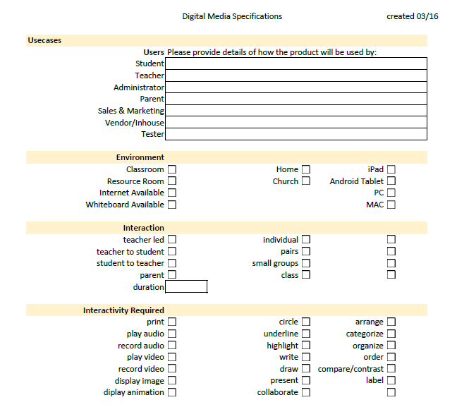 I created this Digital Media Specifications document to flush out the required inputs and output for digital products. The Business Departments would use this as a basis for creating budgeting worksheets while the project teams used it for estimating cost and resources. This document will get updated on a regular basis as the media formats change so often.
