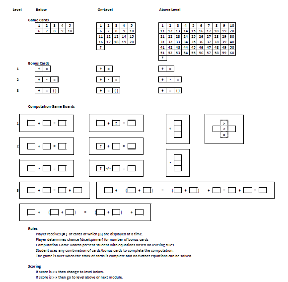 My #1 go-to-tool is Excel. I use it to track all the project details so will often use the grids to create my wireframes to keep everything in one workbook. Here I was outlining the basic functionality needed to create a variety of number sense games that would primarily rely on drag-and-drop functionality of the term/number, definition/word form, and model activities in a variety of settings. From this concept drawing, the Design team created the art direction for game activities and worlds, the Media team developed audio and sound files, the Production team developed the xml and the Developers created the HTML5 or Unity game files and the Assessment team created the learning paths and reporting/award systems.