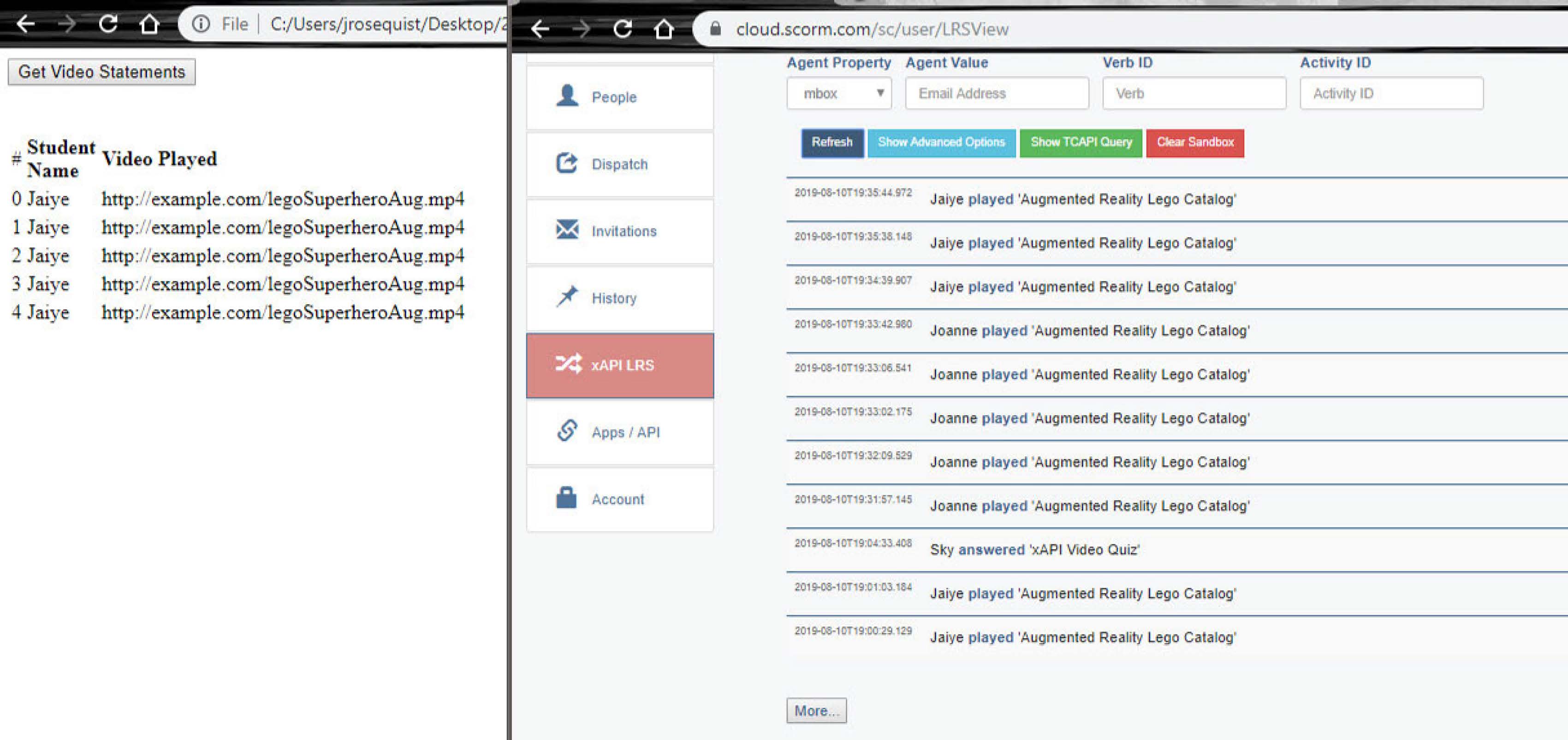 I became interested in interactive video after HiHaHo.com helped me with an xAPI test project. I have a short video that shows a sample of an AR project I had worked on for a class on Coursera. I have used this video along the sample files that past xAPI Cohorters have so generously shared on Github to get statements from SCORMCloud. I intend to continue to practice until I have a generic template that I can post on Github for those that follow behind me.